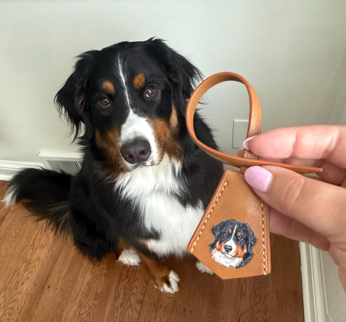 This elegant pet bag charm is meticulously handcrafted from Chèvre Sully, a premium French goat leather prized for its durability and supple, luxurious texture. Each piece is individually cut, hand-sewn, edge-painted, and finely hand-painted with a custom portrait of your beloved pet.